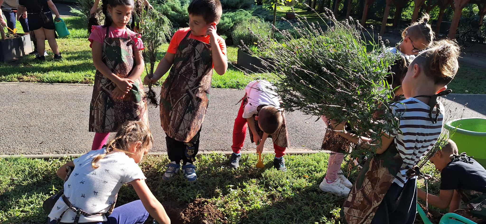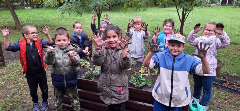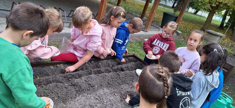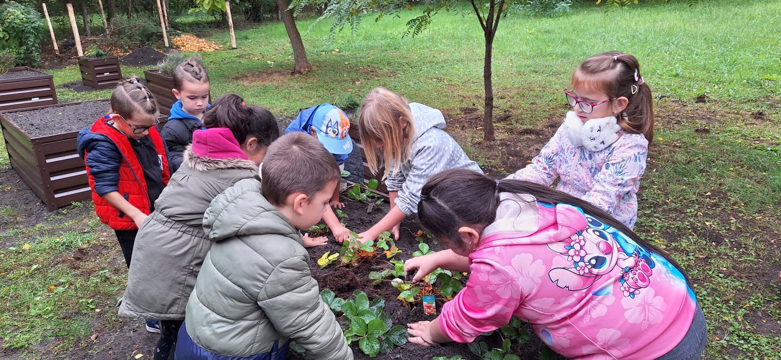 Ősszel a karbantartó bácsik segítségével előkészítettük az ágyásokat, megismertük a különféle kerti szerszámokat és eszközöket, valamint megtanultuk, hogyan kell azokat biztonságosan és helyesen használni. Ültettünk levendulát, árvácskát, mentát, fodormentát és szamócát, hagymát duggattunk, és közben beszélgettünk a különféle hagymafajtákról és felhasználásukról is. A jó hangulatot az Érik a szőlő című népdal közös eléneklése tette teljessé.